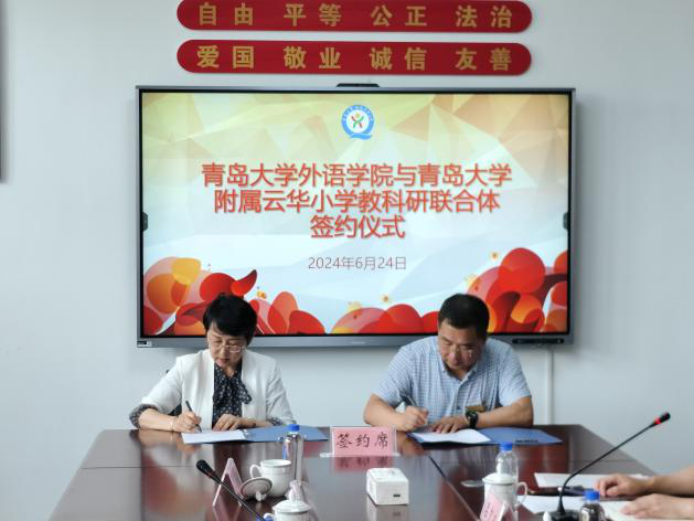 在Beat365唯一官方网站附属云华小学调研时,云华小学校长刘学友、副校长李守业、挂职教师英语教育系副主任吕凯良老师和青岛中仁集团董事长张述仁带领外院一行参观了学校以“两楼两苑一基地”为特色的校园文化。座谈交流时,刘校长对吕凯良老师在校园文化建设和学科发展方面的工作给与高度认可,双方就教育教学、人才培养、师资队伍建设等方面进行了深入交流,卞建华和刘学友签订了建设教科研联合体合作协议书,周伟和刘学友共同为“大学生实习基地”揭牌。