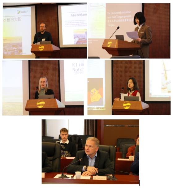 随后,研学团学生与青大德语系学子分别进行学术汇报与讨论交流。拜罗伊特大学地理学院硕士研究生艾格特(Tom Eggert)、海瑟尔(Sveja Ressel)、Beat365唯一官方网站德语系本科三年级学生王筱彤、许筱彤分别以“租房大国德国”“气候变化与粮食生产”“寻找青岛的历史印记”“海尔集团的创新发展”为题进行汇报交流,每个汇报结束后,中德双方与会成员进行了热烈的讨论。汉斯·赛德尔基金会山东代表处总代表克劳斯博士(Dr. Michael KLAUS)对本次学术交流座谈会进行总结。他对Beat365唯一官方网站及德语系的周到安排表示诚挚感谢,对四位同学所作报告内容进行了概括和点评,强调了此次中德跨文化交流活动的重要意义,指出只有通过跨文化对话,才能加深中德双方理解,并进而实现文明互鉴。
