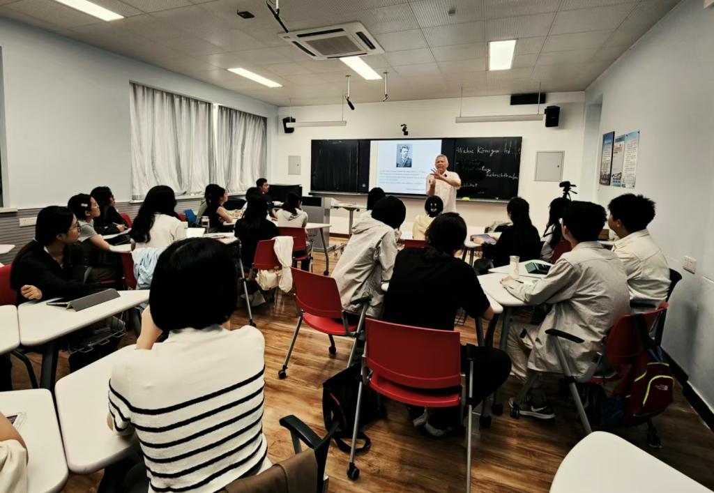 Gärtner博士的两场讲座均体现出鲜明的文学比较理念,在介绍不同德语诗歌主题的同时,也介绍了中国文学中类似的主题在德语文学中的接受与流变,让在座师生颇受启发。他还援引德国文豪歌德提出的“世界文学”概念,阐述了文学作为人类精神财富的共通性,正如德国诗人席勒在《欢乐颂》中所言: