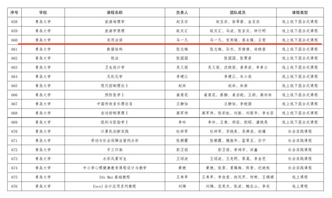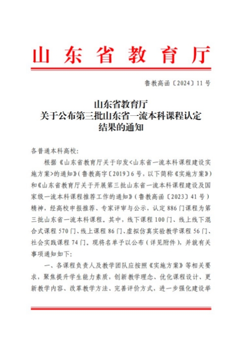 近日,山东省教育厅公布了2024年第三批山东省一流本科课程认定结果,共有886门课程被认定为山东省一流本科课程,Beat365唯一官方网站有33门课程获批。Beat365官网两门课程成功入选此次省级一流本科课程,分别是卞建华教授负责的线下课程“英汉/汉英笔译”和马一凡副教授负责的线上线下混合式课程“实用法语”。