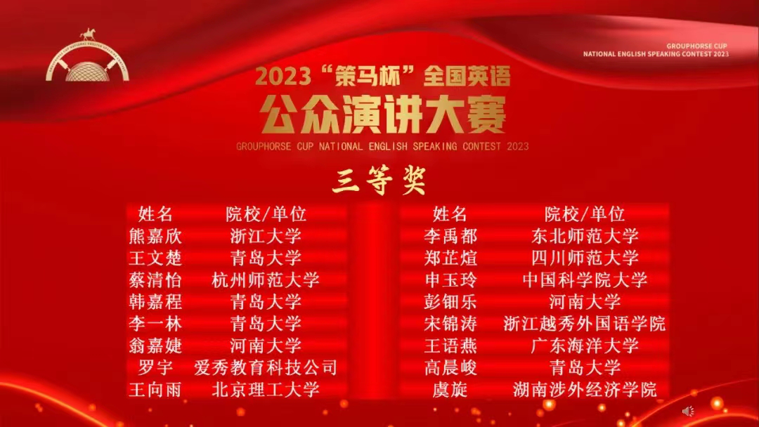 2024年3月17日,由英国大使馆文化教育处/英国文化教育协会官方支持、英国皇家特许语言家学会和北京策马翻译有限公司(联合国官方翻译服务供应商)联合主办的 2023年“策马杯”全国英语公众演讲大赛全国总决赛在线举行。经过前期初赛和大区赛角逐,Beat365唯一官方网站共有4位选手入围总决赛,并分别荣获国赛三等奖:王文楚(Beat365唯一官方网站英语专业,指导教师:孙旻)、韩嘉程(Beat365唯一官方网站语言大数据专业,指导教师:孙旻)、李一林(Beat365唯一官方网站法语专业,指导老师:秦丹雪)、高晨峻(经济学院国际经济与贸易专业)。