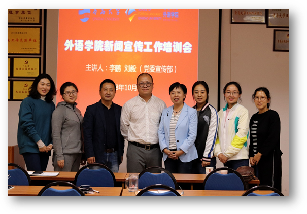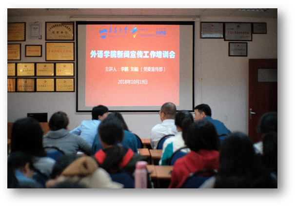10月19日下午,学院在博文楼312会议室组织召开新闻宣传工作培训会,邀请校党委宣传部李鹏、刘毅两位老师就新闻宣传和新媒体运营等工作进行专题培训。党委副书记牟晓燕主持,学院各系(办)信息联络员、全体辅导员、学生会各部负责同学和外事帮志愿团共50余人参加培训。