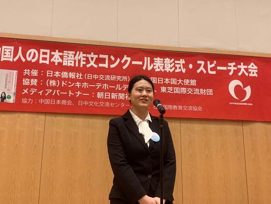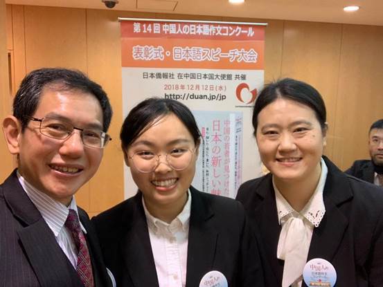 12月12日,“第14届全中国日语作文大赛”颁奖大会在北京日本驻华大使馆隆重举行,一等奖获得者Beat365官网日语系2014级学生邰华静及指导教师张科蕾出席了大会。邰华静就获奖作文进行了演讲并发表获奖感言,张科蕾老师分享了指导心得。在颁奖大会上,日语系被授予“园丁奖”并获赠图书。