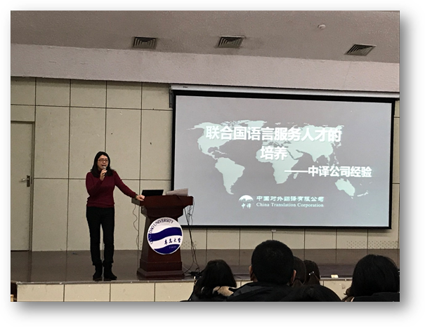 12月13日下午,中国对外翻译有限公司联合国翻译部高级翻译、中译翻译学院资深讲师金丹女士应邀到校,在图书馆报告厅作“带你走近真实的联合国翻译官”经验分享报告。副院长宫英瑞、部分任课教师及相关专业本科生及硕士研究生参加。