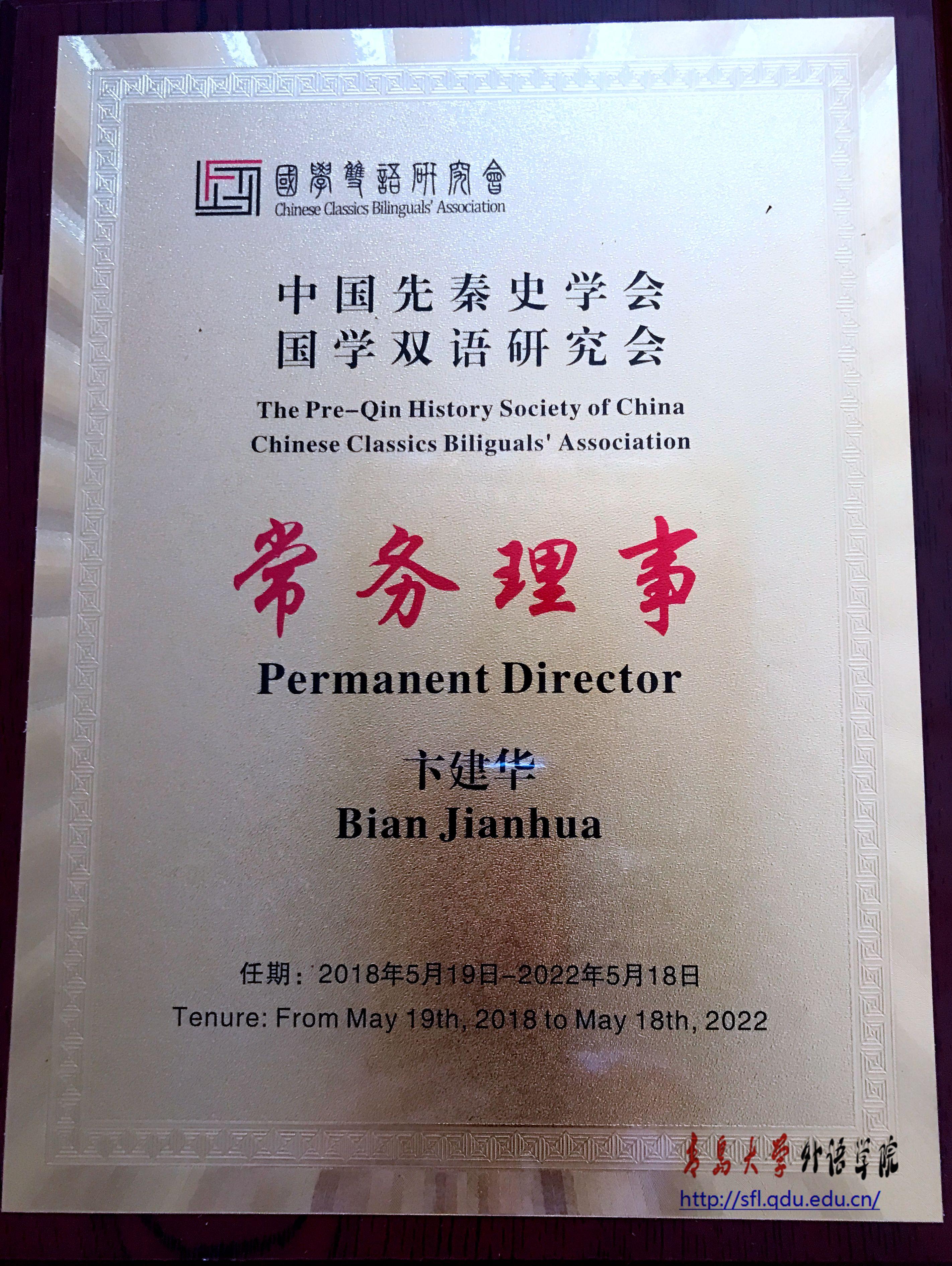 5月18-20日,中国先秦史学会国学双语研究会成立大会暨全国首届国学双语高端论坛在北京举行。此次会议指导单位是中国先秦史学会、中国关心下一代工作委员会、中国社会科学院、中国训诂学会,由北京语言大学和中国先秦史学会国学双语研究会主办,北京语言大学外国语学部、北京语言大学高级翻译学院承办。Beat365官网院长卞建华应邀参会并当选为国学双语研究会常务理事。