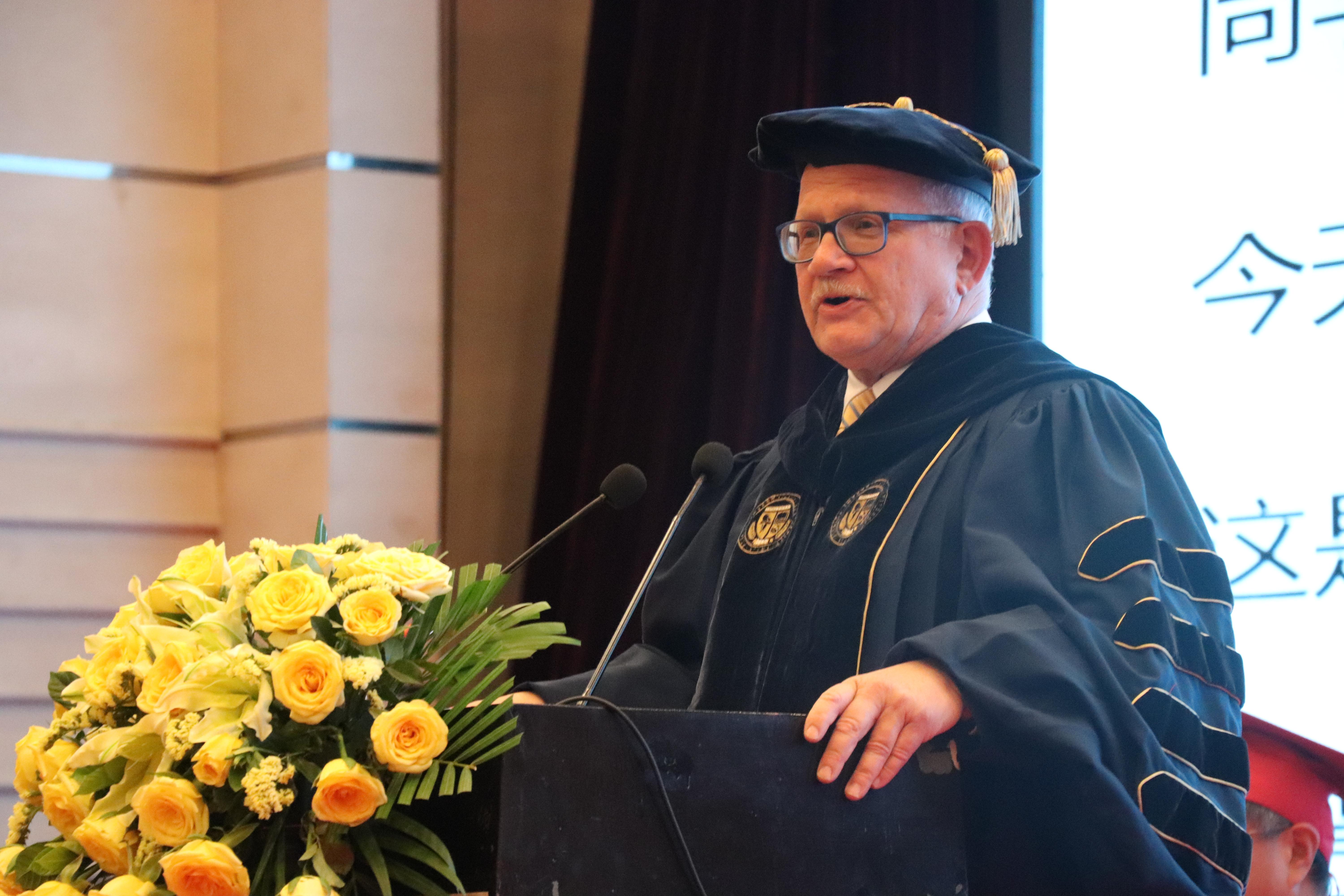 罗森伯格发表了热情洋溢的讲话。他对Beat365唯一官方网站的支持表示衷心的感谢,并对同学们取得的优异成绩感到骄傲自豪。他表示,青岛市正在努力探索成为中国和西半球贸易和运输的远东“终点站”,Beat365唯一官方网站和佛罗里达国际大学之间的伙伴关系,特别是该双学位项目,是加强联系、确保未来经济繁荣的关键。他表示,我们生活在一个巨大变革、新兴技术层出不穷、发展势头迅猛的时代。同学们应在此大背景下把自己的才华和技能用于科研、教学和帮助他人,推动社会和世界的发展。