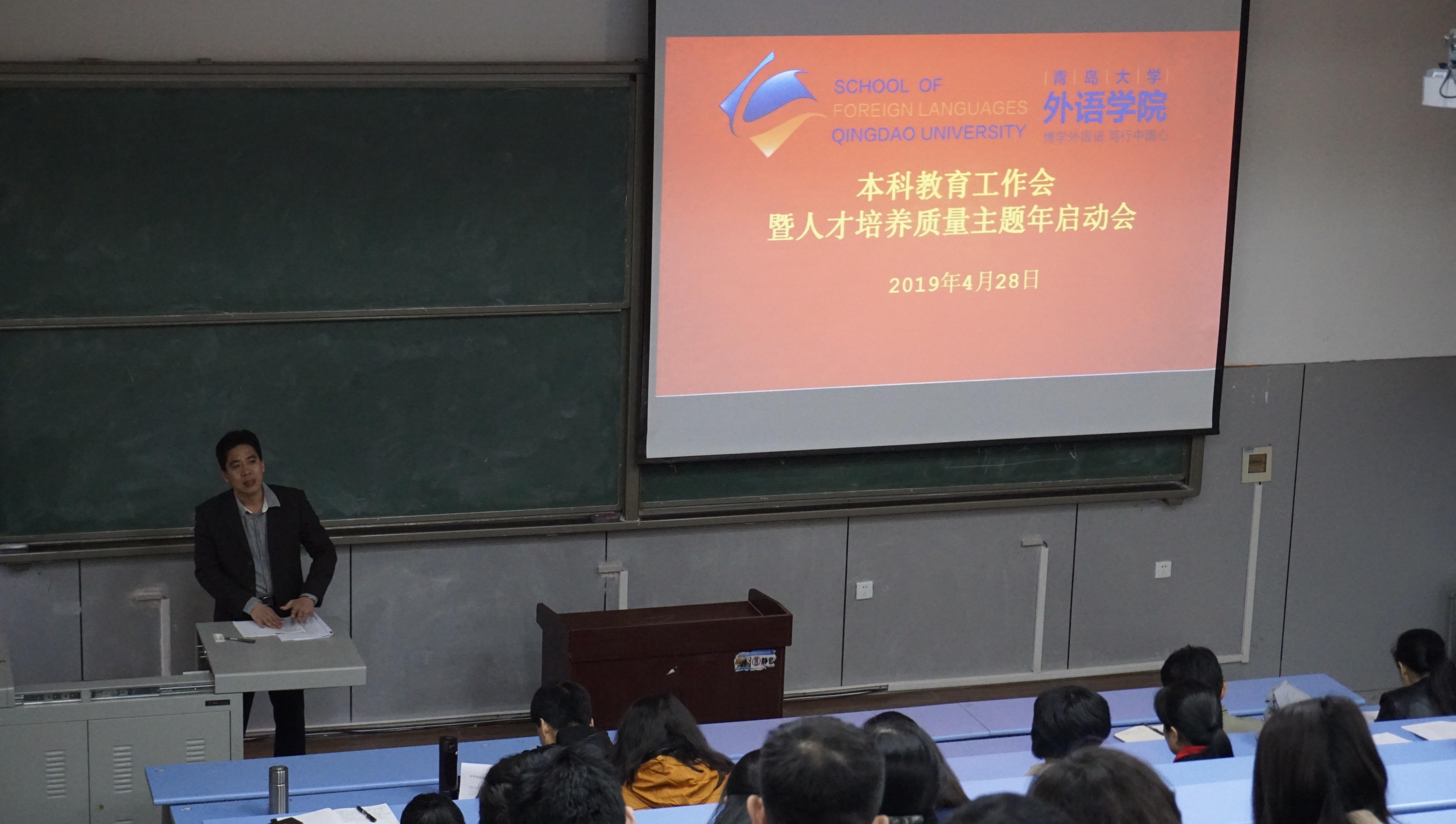 在报告中,孔伟金首先从新时代高等教育改革与发展的背景讲起,解读了2018年全国教育工作会、新时代全国高等学校本科教育工作会、山东省教育大会、校第三次党代会等会议精神。然后,以“人才培养基础工程干什么、怎么干”为主线,重点围绕学校在“专业认证、课程建设、创新创业、人才培养国际化、专业建设、教师教学能力提升、教学评价体系与机制、本科招生与就业、教学质量提升”等十个方面的思路与举措进行了系统阐述。最后,孔伟金结合Beat365唯一官方网站在发展定位、人才培养定位、学院继续深造率和学生竞赛、人才培养标志性成果培育、激发学生学习兴趣和潜能等方面存在的问题,提出了可行性建议。他希望外院全体教职工切实把本科教育工作摆在重要位置,以提升人才培养质量为目标,系统谋划好教学、科研、学科建设的融合发展工作,力争探索打造提升本科教育质量的外院模式。