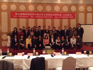 由中国人民对外友好协会、中韩友好协会和韩中友好协会共同主办的第九届锦湖韩亚杯中国大学生韩国语演讲比赛山东赛区预选赛11月28日在青岛颐中皇冠大酒店隆重举行。