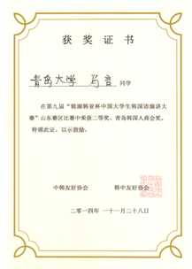 马言同学荣获第九届锦湖韩亚杯中国大学生韩国语演讲比赛山东赛区预选赛二等奖