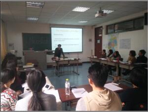 与此同时,在隔壁309教室,另一位来自慕尼黑应用语言大学的老师Klaus Ziegler教授正为德语系老师介绍“ 慕尼黑应用语言大学会议翻译硕士课程入学考试”。报告长达三个半小时,Ziegler教授除介绍考试内容之外,还与德语系老师们就今后如何拓展双方合作,进行了深入交流,并达成初步构想。