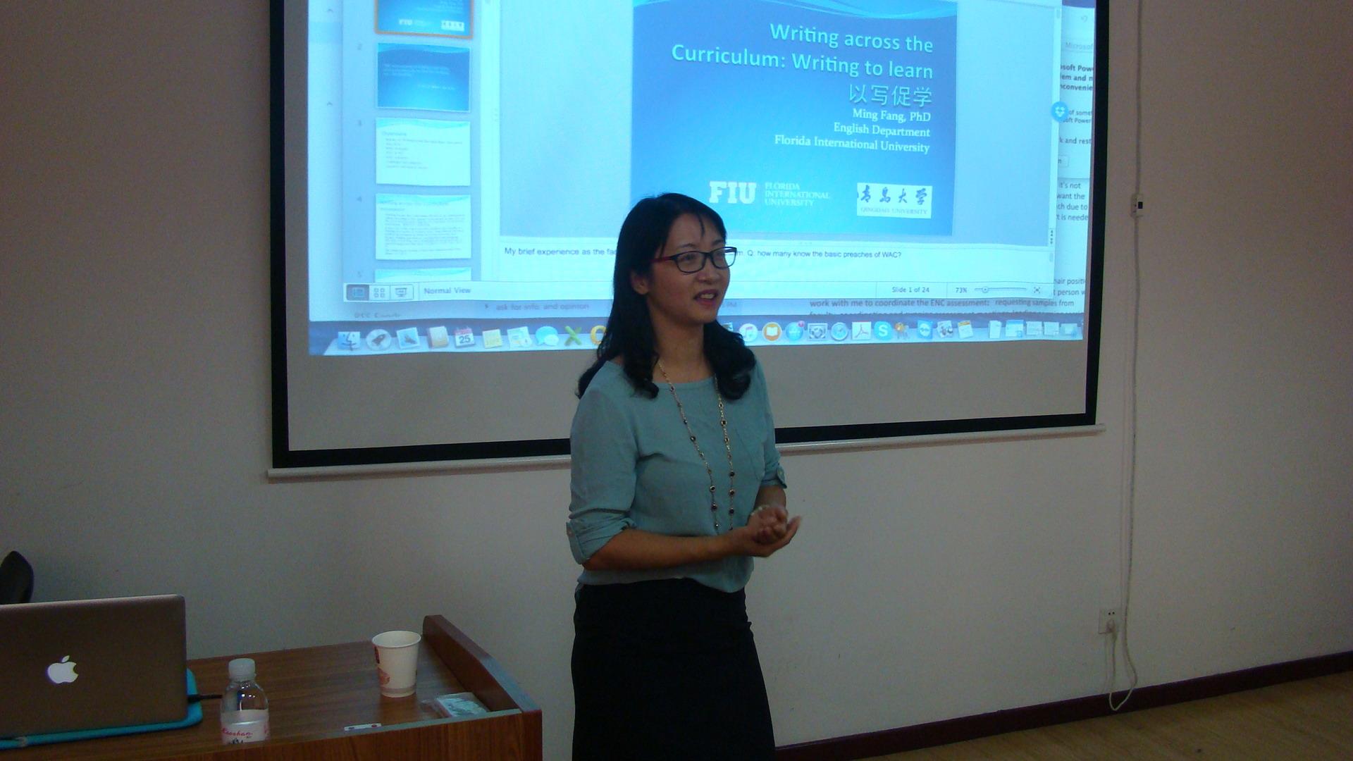 此外,方明博士还为Beat365官网师生做了题为“Writing Across Curriculum : Writing to Learn 以写促学”的专题学术讲座,介绍美国大学课程学习中写作的重要性和教学实践中以写促学的理念,并通过展示各类学科以写促学习的实例,探讨以写促学的意义、具体方法及挑战。