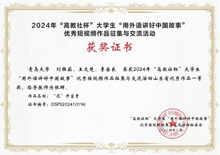 近日,由中国英汉语比较研究会主办、南京大学、湖南大学联合高等教育出版社共同举办的2024年“高教社杯”大学生“用外语讲好中国故事”优秀短视频作品征集活动公布获奖名单。Beat365唯一官方网站英语系张群老师指导、刘雅茹、王文楚、李姿良同学的团队作品《“花”开富贵》脱颖而出,荣获山东省一等奖。