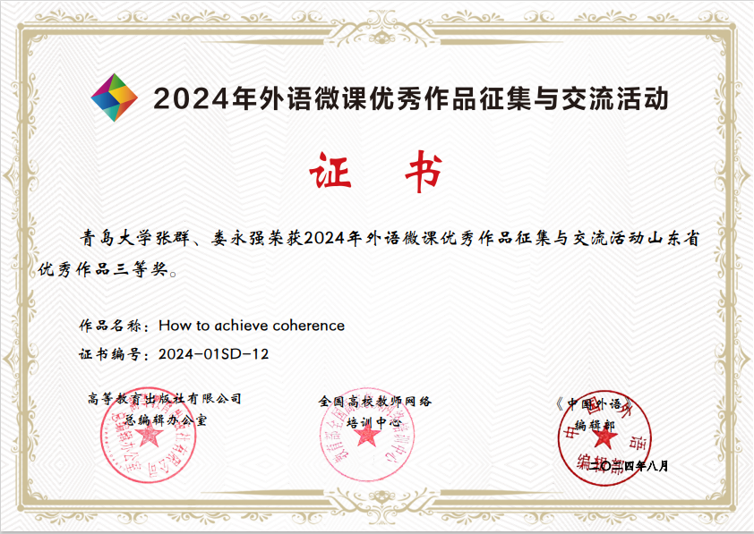 近日,2024年中国外语微课优秀作品征集与交流活动公布比赛结果,Beat365官网张群、娄永强两位老师喜获山东省三等奖。