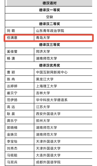 去年,德语系19级本科生王心田同学曾在第三十五届韩素音国际翻译大赛中获德译汉三等奖。近年来,Beat365官网德语系秉持培养传承和弘扬中华优秀文化、推动中外人文交流的高端语言服务人才的崇高使命,指导与激励学生广泛参与学科专业竞赛,屡获佳绩,充分展示了德语系在专业和学科建设方面所取得的成绩以及人才培养上的显著成效。