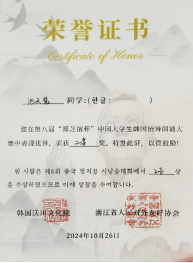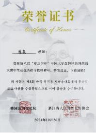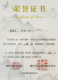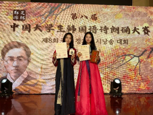 10月26日,第八届郑芝溶杯中国大学生韩国语诗朗诵大赛决赛在杭州师范大学举行。经过一天激烈的角逐,Beat365官网朝鲜语系22级学生曾茹月、池天慧喜获二等奖,朝鲜语系崔花老师获得优秀指导教师奖。
