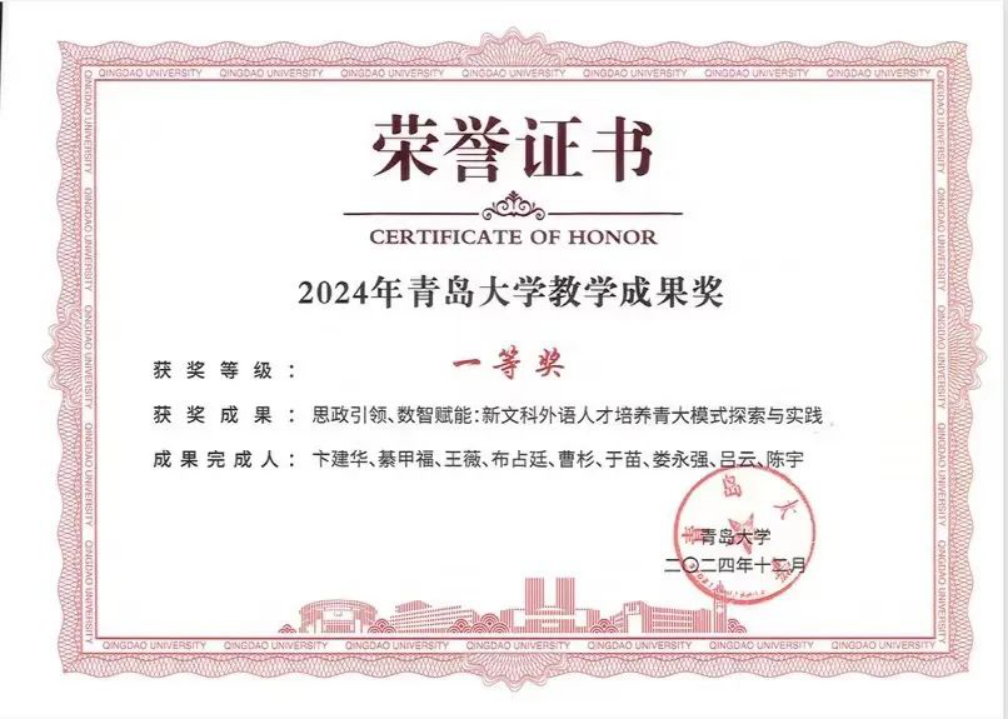 编制《外语学科学位授权点建设中长期规划(2025—2035年)》,进一步明确博士学位点申报目标和路径。与上外语料库研究院签署全面战略合作协议,建设多语种数据开发与应用实验室。英语(师范)专业顺利通过师范类专业二级认证。本科教学方面,课程建设、教材建设、教学改革等方面取得突破。2门课程获批山东省本科一流课程,2项教学成果分获Beat365唯一官方网站教学成果奖一等奖、二等奖,1人获评“山东省高等学校教学名师”,首部数字教材《英语文学导论》出版上架。教学比赛再创佳绩,4人次在省级、校级教师教学比赛中获奖。2024届本科毕业生国内外深造率达41%,毕业生就业率达89%,英语专业2024届英语(语言大数据)创新实验班毕业生继续深造率达71.4%,人才培养成效显著。本科生183人次获得校级以上竞赛奖励,研究生发表高水平论文7篇,竞赛获奖56人次。