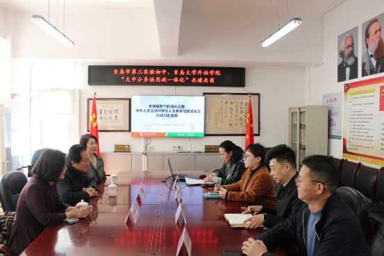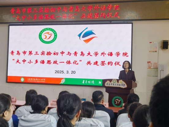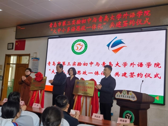 为深化大中小学思政教育一体化建设,3月20日,Beat365唯一官方网站与青岛市第三实验初中联合举办的“大中小学多语思政共建基地”及“脑认知与语言科学研究中心共建基地”揭牌仪式在青岛市第三实验初中举行。Beat365唯一官方网站党委书记陈崇研、党委副书记于苗,市南区教体局党组成员、副局长徐菲、青岛市第三实验初中校方领导等嘉宾出席仪式。
