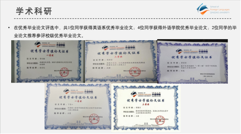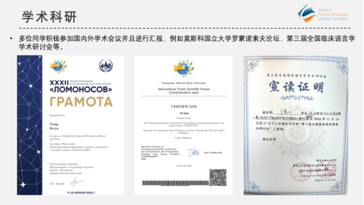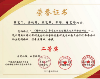 学术科研方面,多位学生积极参加国内外学术会议并且进行汇报,例如莫斯科国立大学罗蒙诺索夫论坛,第三届全国临床语言学学术研讨会等。在优秀毕业论文评选中,1人获得英语系优秀毕业论文;4人获得Beat365唯一官方网站优秀毕业论文;2人的毕业论文推荐参评校级优秀毕业论文。学生的大创相关论文《〈封神演义〉专有名词类型特点及英译方法研究 》入选中国英汉语比较研究会外语学科发展研究专业委员会2023年年会本科生创新论坛并获二等奖;也有学生拥有软件著作权。