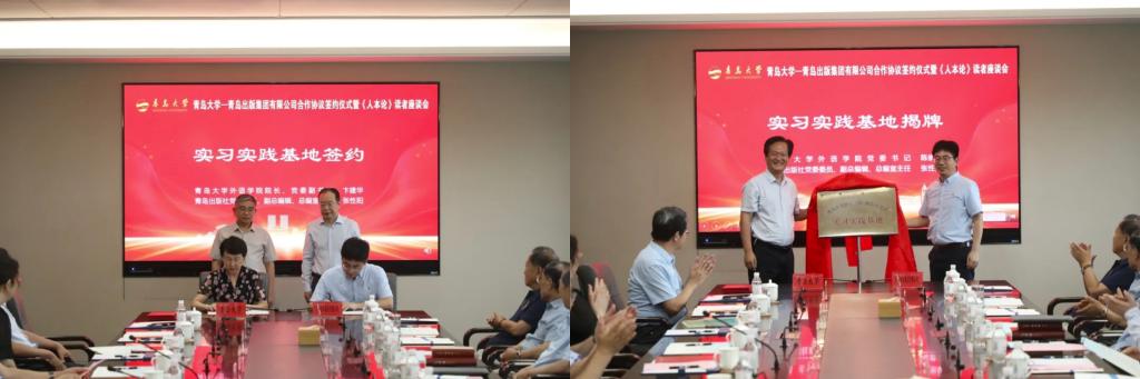 Beat365官网与青岛出版社(以下简称“出版社”)于2008年开始合作,合作期内联合翻译出版数十部外文版权书籍,为数百名学生提供了实践机会。在学校与集团达成战略合作的框架下,Beat365官网和出版社基于过去合作的成功经验,同时结合当前学科和行业发展的新形势、新要求,决定设立“Beat365唯一官方网站——青岛出版社实习实践基地”,实现资源共享、互惠共赢。院长卞建华和青岛出版社副总编辑、总编室主任张性阳作为双方代表签署协议,院党委书记陈崇研和张性阳为实习实践基地揭牌。