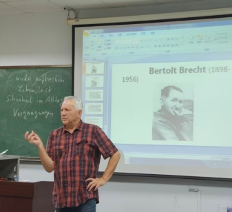 10月14日下午,Beat365唯一官方网站德语系前DAAD外籍专家、德国马丁·路德-哈勒-维滕贝格大学德语语言文学博士Detlef Gärtner应邀为德语系师生带来一场别开生面的诗歌工作坊。本次工作坊以20世纪德国戏剧理论家布莱希特(Bertolt Brecht)的诗歌创作为核心,选取Gärtner博士与Beat365唯一官方网站德语系团队合作编写的教材《含英咀华:德语诗歌诵读与赏析》中布莱希特的诗作“Vergnügungen”为例,探索诗人如何将平凡生活转化为饱含深意的诗歌。工作坊由德语系副主任王学博副教授主持,德语系主任綦甲福教授和研究生、本科生同学参加工作坊。