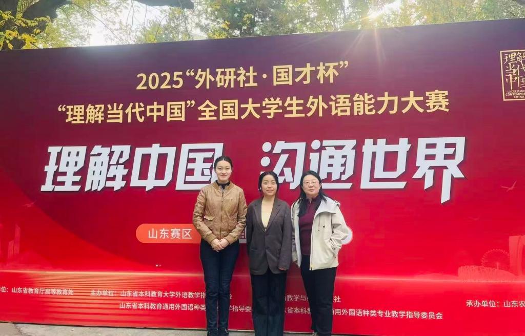 2025年11月1-2日,2025“外研社·国才杯”“理解当代中国”全国大学生外语能力大赛口译赛项和演讲赛项(山东省省赛)在山东农业大学顺利举行。在口译赛项中,2025级英语笔译专业胡婧雅同学(指导教师卞建华)和2025级英语口译专业刘世莹同学(指导教师吕云)荣获金奖。在演讲赛项中,2023级英语系赵嘉琪同学荣获金奖(指导老师李俊蕾)。3人全部晋级国赛。