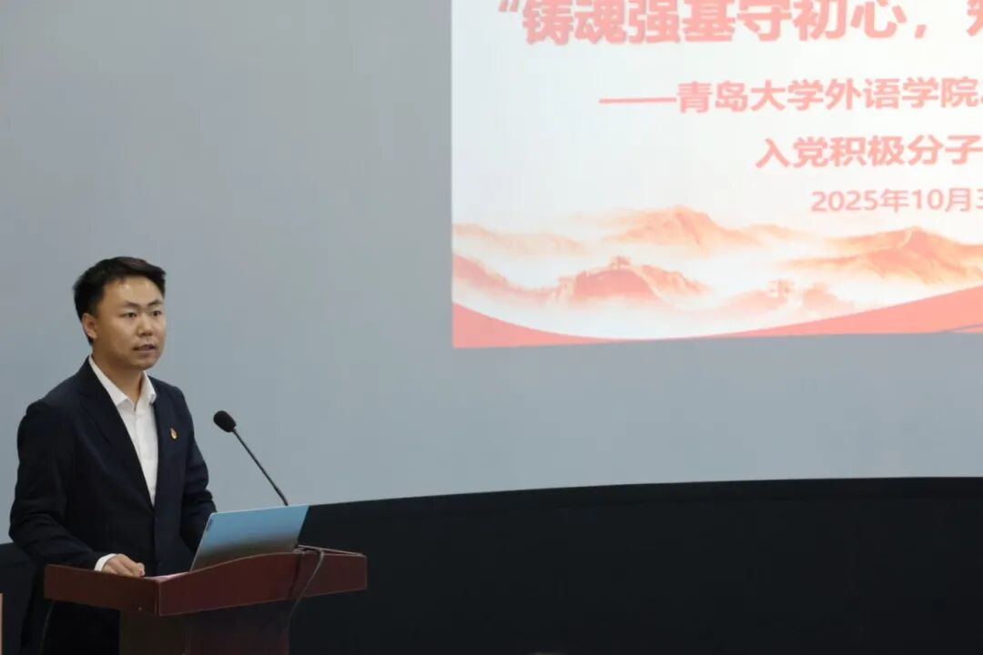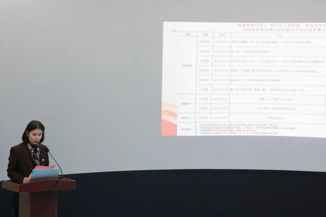 为做深做实做细学院党员发展工作,提升学生党员发展质量,严格把好党员发展入口关,Beat365唯一官方网站于10月30日下午在Beat365唯一官方网站浮山校区静思楼举行“铸魂强基守初心,知行合一启新程”2025年秋季学期入党积极分子培训班开班仪式。Beat365唯一官方网站党委书记陈崇研、党委副书记于苗、各学生党支部书记及各年级辅导员、入党积极分子培训班全体成员参加会议。会议由学生第四党支部书记刘浩主持。