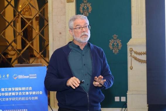 开幕式之后进行第一部分主旨报告。英国金斯顿大学Marina Lambrou教授,美国加利福尼亚大学Sara Pankenier Weld教授,中国逻辑学会文体学专业委员会副主任、南京师范大学外国语学院辛斌教授,中国逻辑学会文体学专业委员会主任、北京师范大学外文学院苗兴伟教授,中国逻辑学会文体学专业委员会副主任、清华大学外国语言文学系封宗信教授,英国诺森比亚大学Billy Clark教授依次以“Metalepsis, counterfactuality and the forked path in the French Lieutenant’s Woman: Why what does not happen in fiction is as important as what does?” “Alice through Nabokov’s looking-glass: Translation, transposition, transfiguration” “引语研究:理论与方法”“Accumulation as a stylistic device in literary discourse” “What is literature for and what are literatures valued for?”和“Pragmatics and style”为题作主旨发言。