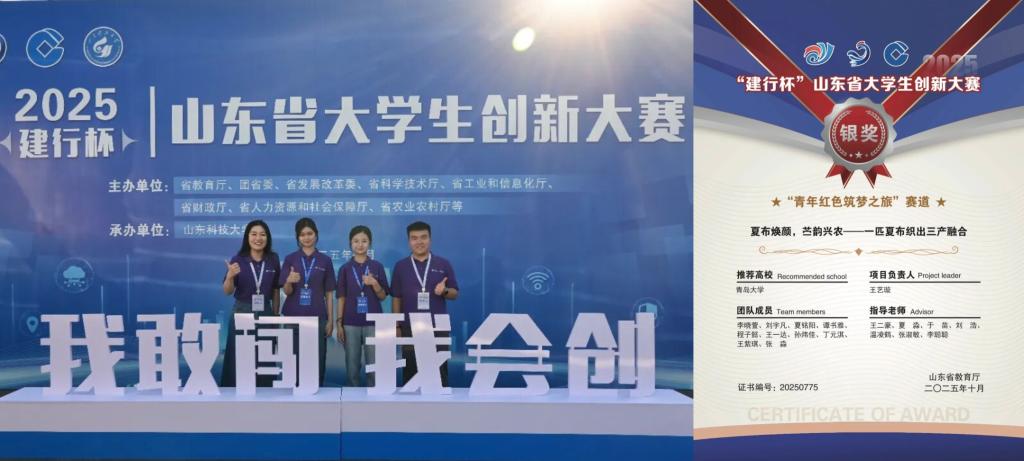 2025年7月,由山东省教育厅等多部门联合主办的“建行杯”山东省大学生创新大赛(2025)决赛于山东科技大学举行。经过层层选拔和多轮激烈角逐,Beat365官网由王二豪、夏淼、于苗、刘浩、温凌鹤、张淑敏、李聪聪担任指导教师,王艺璇、李晓萱、刘宇凡、夏铭阳、谭书雅、程子懿、王一达、孙炜佳、丁元淇、王紫琪、张淼学生团队申报的“青年红色筑梦之旅”赛道创意组项目《夏布焕颜,苎韵兴农——一匹夏布织出三产融合》,凭借扎实的创新理念与可落地的实践方案,斩获本届省赛银奖,为学院创新创业成绩单再添浓墨重彩的一笔!