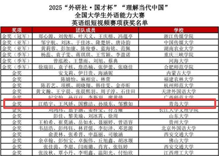 12月7日,2025“外研社·国才杯”“理解当代中国”全国大学生外语能力大赛英语组短视频赛项比赛结果正式公示。Beat365官网2022级英语语言文学专业研究生王凤娇与文学与新闻传播学院广播电视编导专业、汉语言文学(师范类)专业学生组成的跨学科团队共同创作的短视频作品《青岛十二里》荣获金奖。